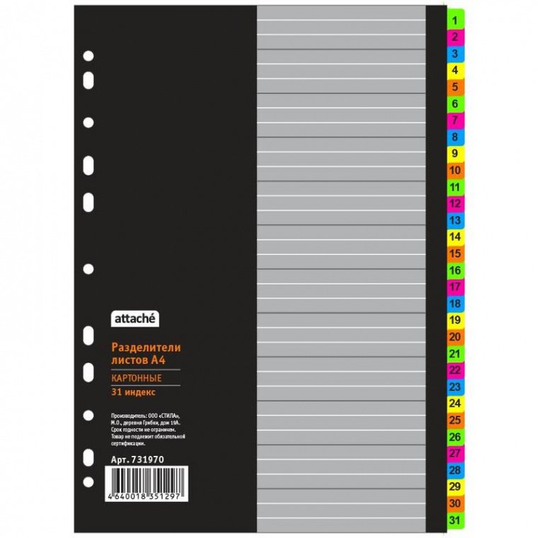 Разделители листов Attache Selection формата А4 изготовлены из прочного картона. Размер — 297×220 мм. Плотность листов — 150 г/кв. м. Универсальная перфорация совместима с различными типами папок. В комплекте 31 лист с двусторонними ярлыками цвета ’НЕОН’ и нанесением индексации, а также титульный лист для удобства и быстроты поиска.