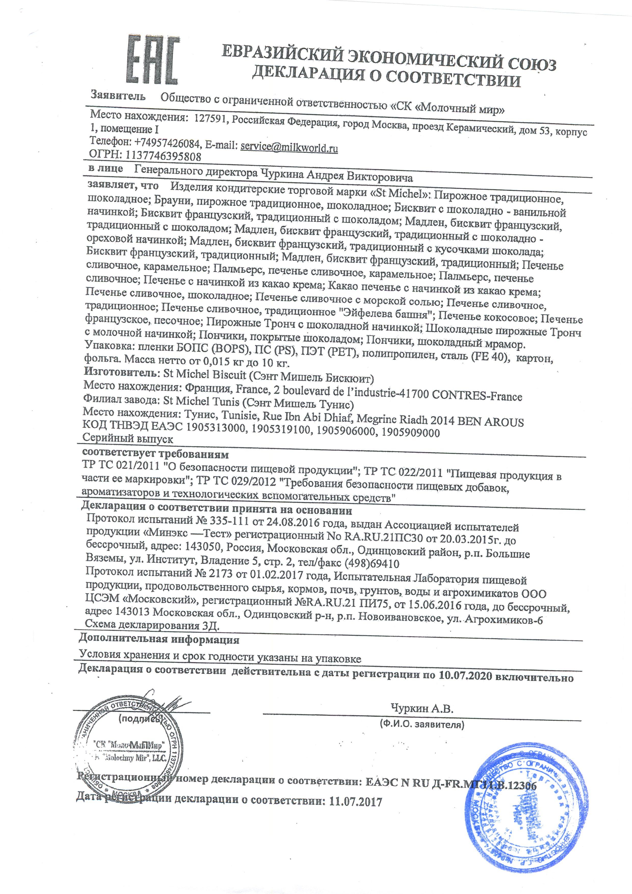 Состав: пшеничная мука, сахар, свежее сливочное масло (20%), пшеничный крахмал, свежее куриное яйцо, глюкозный сироп (пшеница), соль, сливки из коровьего молока, сухое обезжиренное молоко, ароматизаторы, мальтодекстрин, разрыхлитель: карбонаты аммония, декстроза. Содержит: пшеницу, яйцо, молоко. Может содержать орехи.