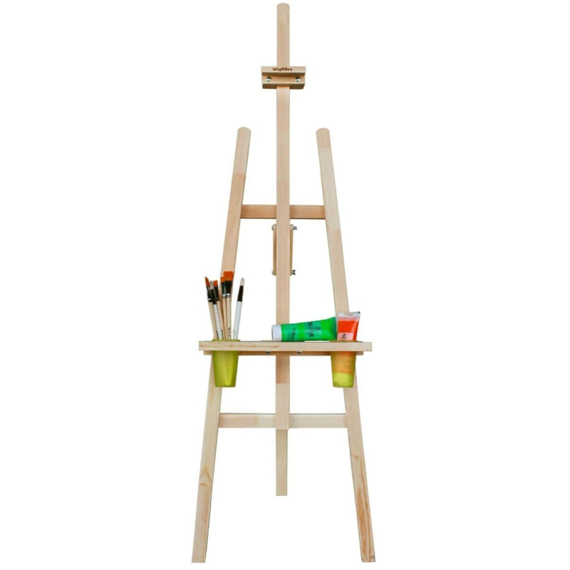 Напольный мольберт Лира с фиксатором для холста прекрасно подойдет для любого вида живописи. Мольберт оснащен широкой полкой со встроенными стаканчиками для удобного хранения рабочих инструментов. Высота мольберта: 165 см; ширина: 45 см; полка: 12 см. 120 см - максимальный размер холста. Простая и удобная система регулировки наклона мольберта и высоты положения планки.