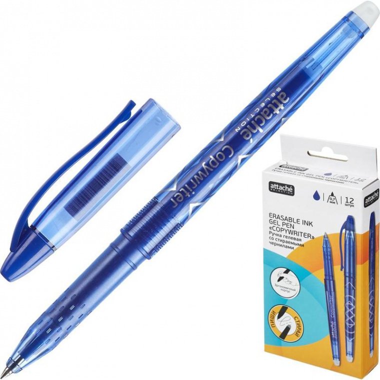 Ручка гелевая Attache Selection обладает уникальными обесцвечивающимися термо-чернилами. Для удаления надписи необходимо потереть её специальным ластиком, встроенным в тыльную часть корпуса ручки. При письме и стирании ручка не повреждает структуру бумаги, делая исправления незаметными. Ручка не рекомендована для использования в деловых документах .Диаметр шарика — 0,5 мм. Толщина линии — 0,7 мм. Длина письма — 100 м. Возможности смены стержня нет.