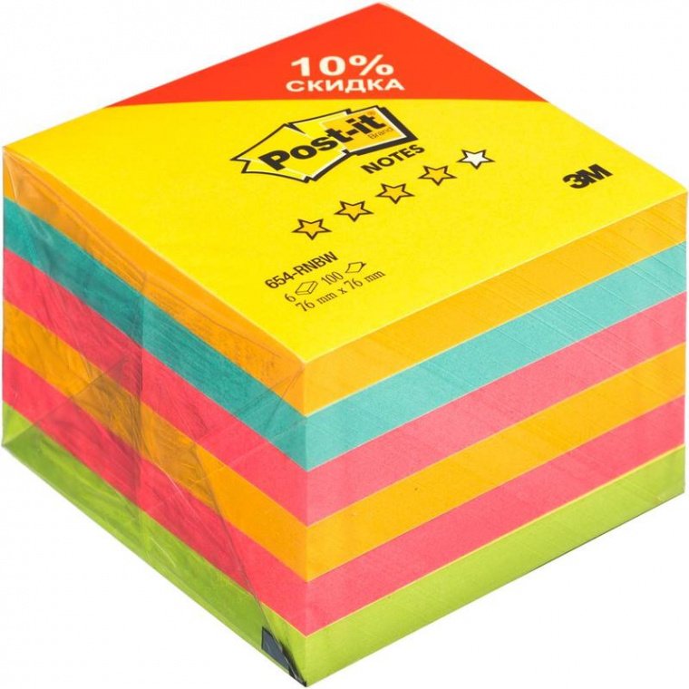В упаковке 6 блоков по 100 листов размером 76×76 мм, упаковано в пленку. Особых условий хранения не требует, сертификации не подлежит, срок годности не ограничен. Бумага на 100% произведена из восстанавливаемых лесов (сертификаты SFI и PEFC). Длина клейкой стороны 76 мм.