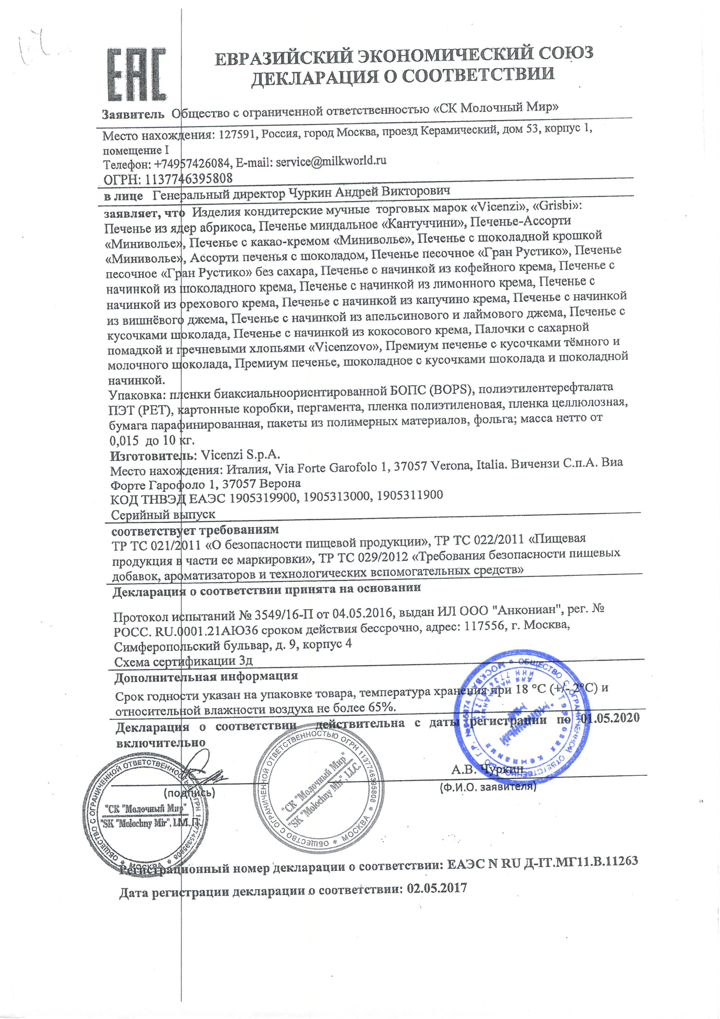 Сертификат на товар - Печенье сдобное Grisbi с ореховым кремом 150 г