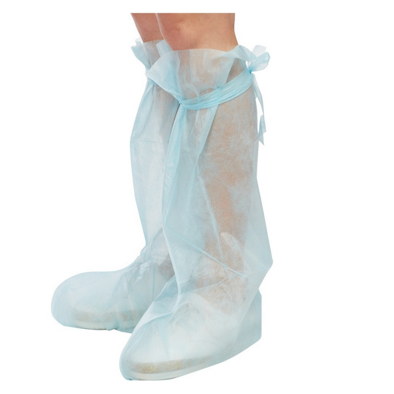 Бахилы хирургические высокие на завязках (сшивные) одноразовые. Высота - 56 см, длина стопы - 40 см, длина завязок - 60 см. Шов оверлочный наружный (нить полиэфирная). Изготовлены из полипропиленового нетканого материала пл. (пл.25 г/м2), обладающего водоотталкивающими свойствами, воздухопроницаемостью и пониженным ворсоотделением. Не скользят по кафельному покрытию пола. Упакованы в полиэтиленовый пакет по 20 шт/упак. Cтерильно. Срок годности 4 года. Количество штук в транспортной упаковке: 155 шт.