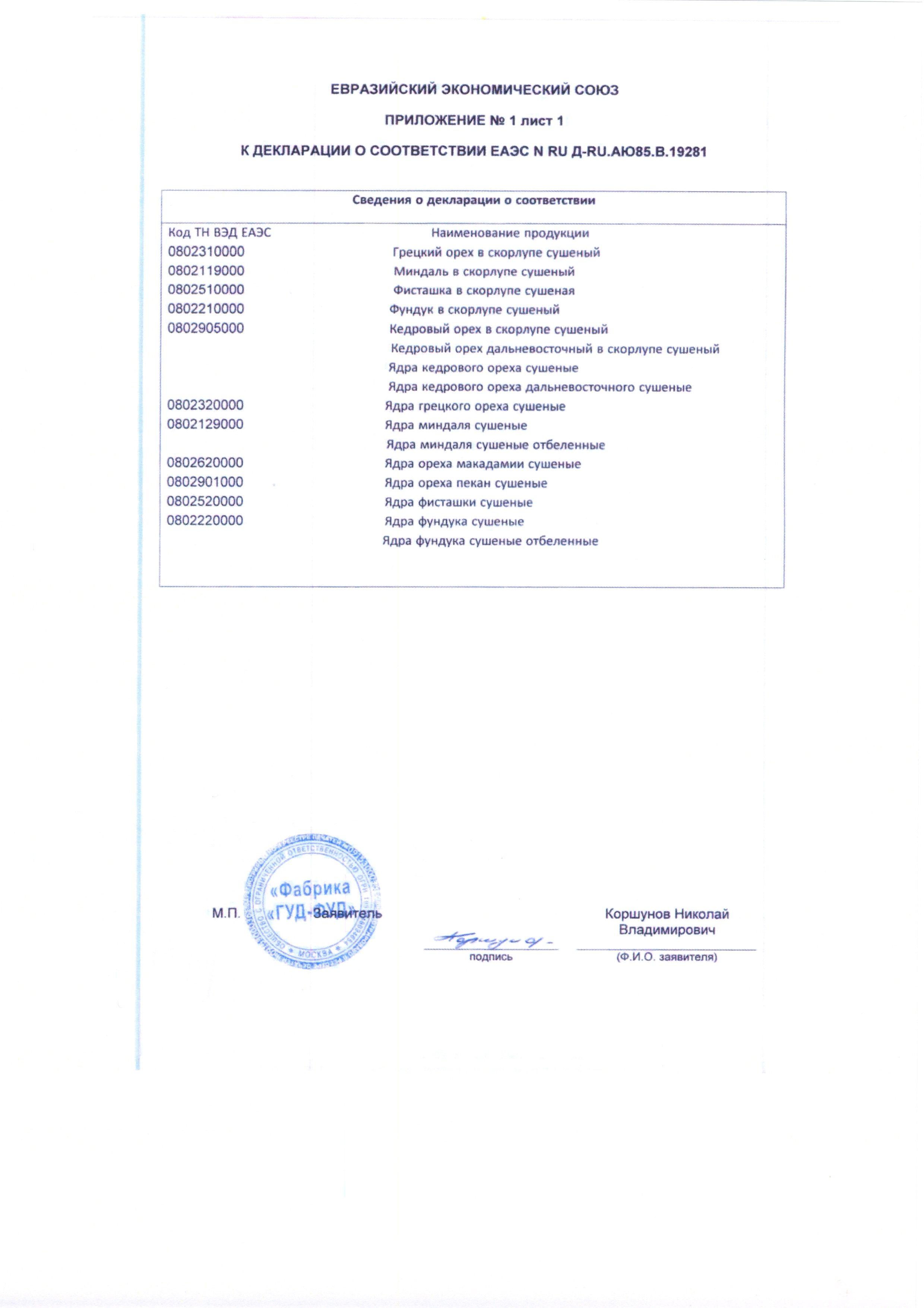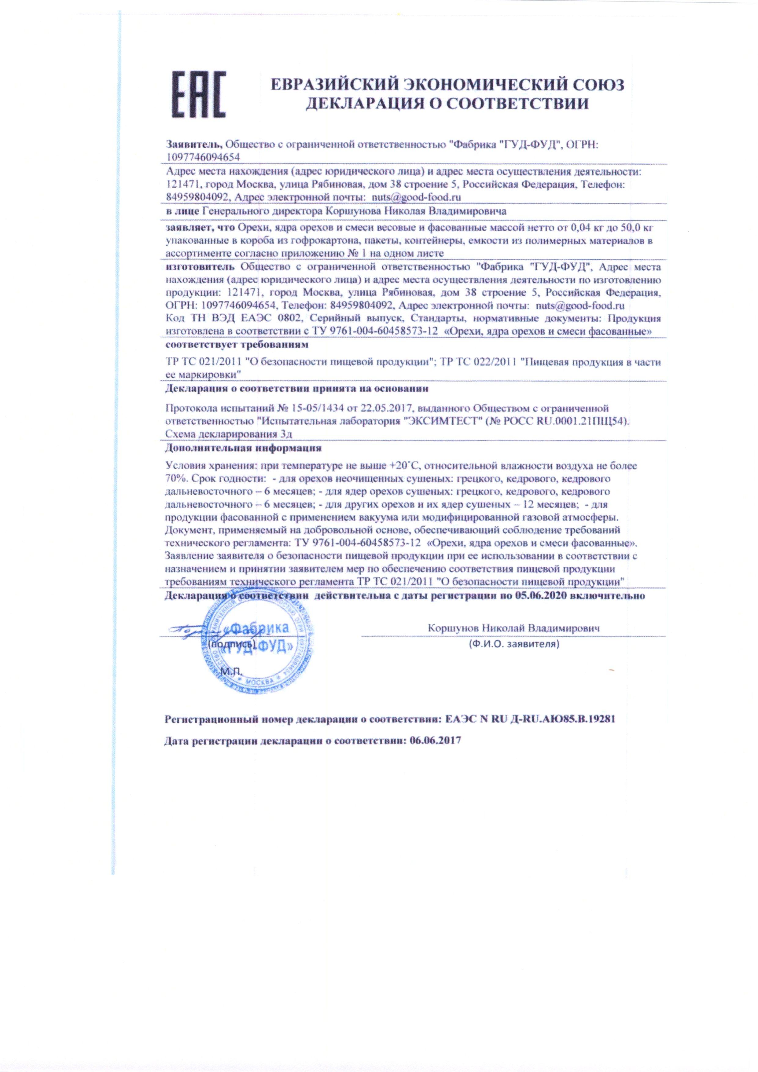 Состав: изюм (виноград сушеный без косточки, подсолнечное масло, консервант Е220), сушеные ядра миндаля, фундука, кешью, бразильского ореха в изменяемых соотношениях.