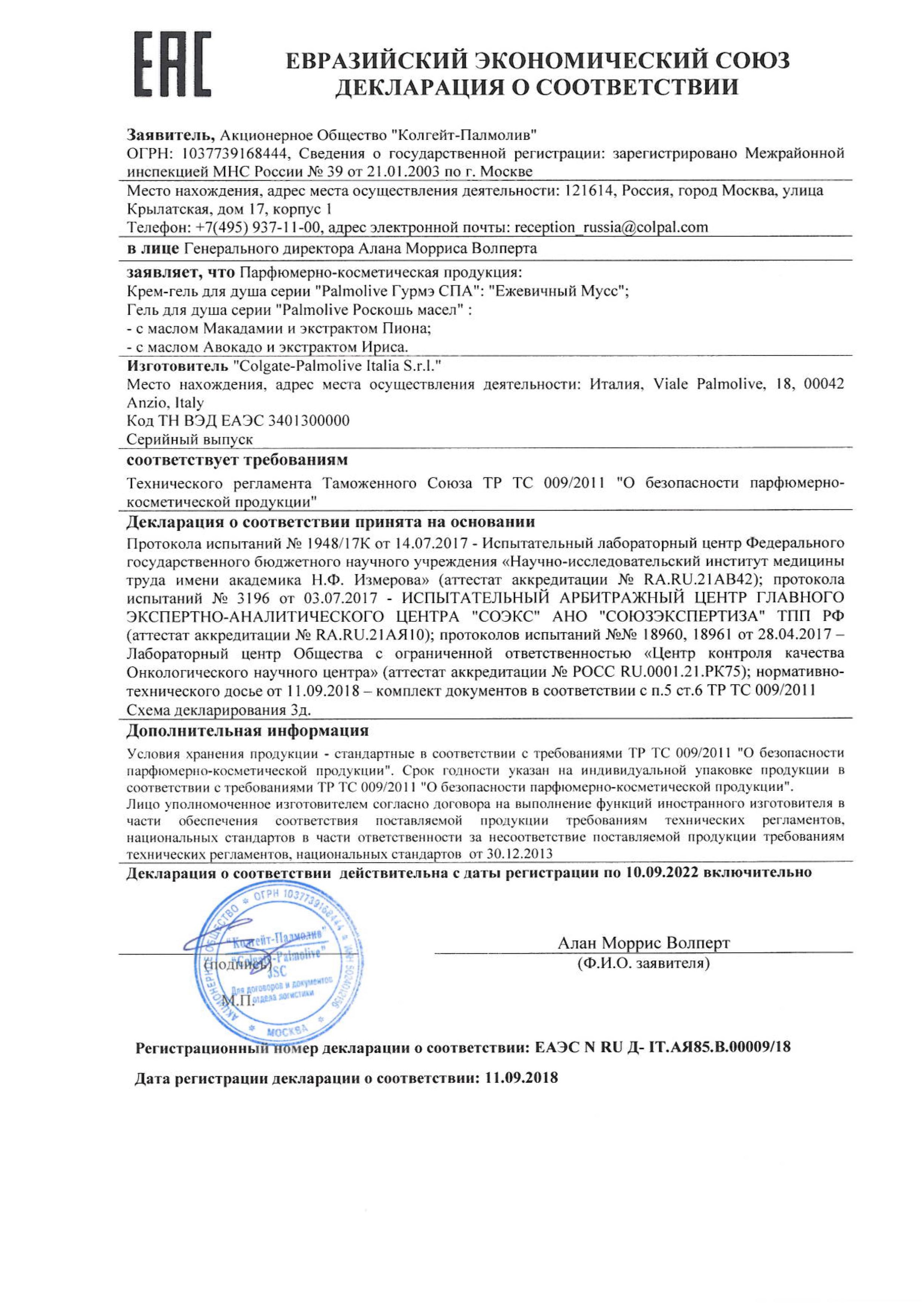 Сертификат на товар - Гель для душа Palmolive Арома Настроение Твое Расслабление 750 мл