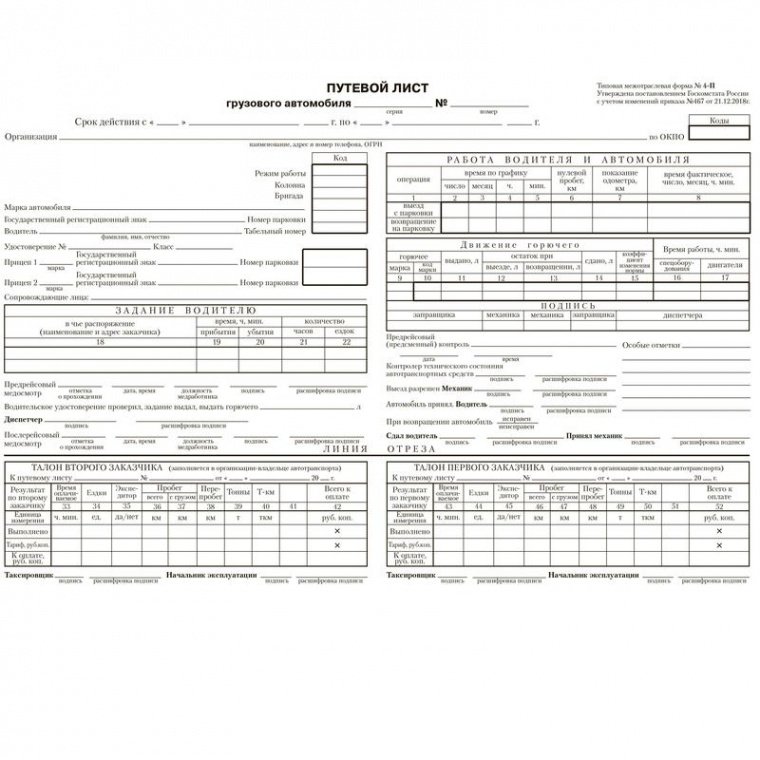 Бухгалтерские бланки — путевой лист грузового автомобиля, обновленная типовая форма 4-П (от 18.01.2017г). Применяются при повременной оплате грузоперевозок. Бланки отпечатаны на офсетной бумаге формата А4. В комплекте 100 штук, клеенных в виде книжки. Упакованы в термоусадочную пленку.