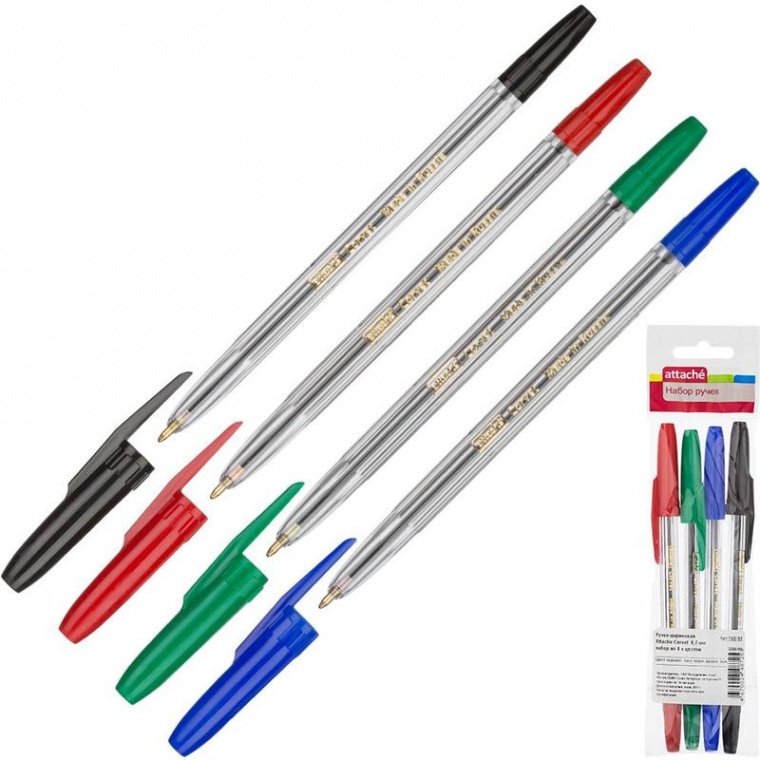 Набор шариковых ручек Attache Corvet 4 цвета (синий, черный, красный, зеленый) Упакован в пакет ВОРР с европодвесом. В гофрокоробе 100 наборов. Корпус прозрачный, изготовлен из пластика, цвета заглушки и колпачка соответствуют цвету чернил. Вентилируемый колпачок. Сменный стержень 152 мм. Диаметр шарика 1 мм, толщина линии письма 0,7 мм.