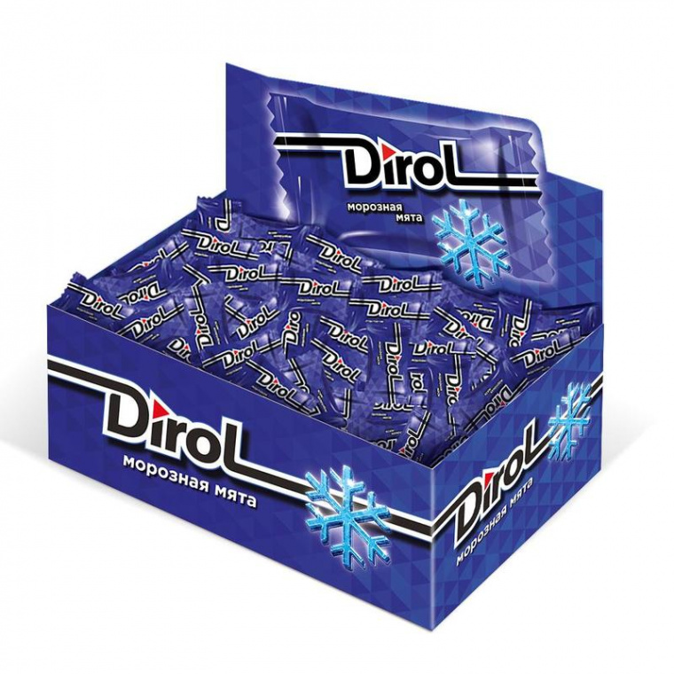 Жевательная резинка Dirol «Морозная Мята» надолго освежит ваше дыхание. Продукт не содержит сахара.