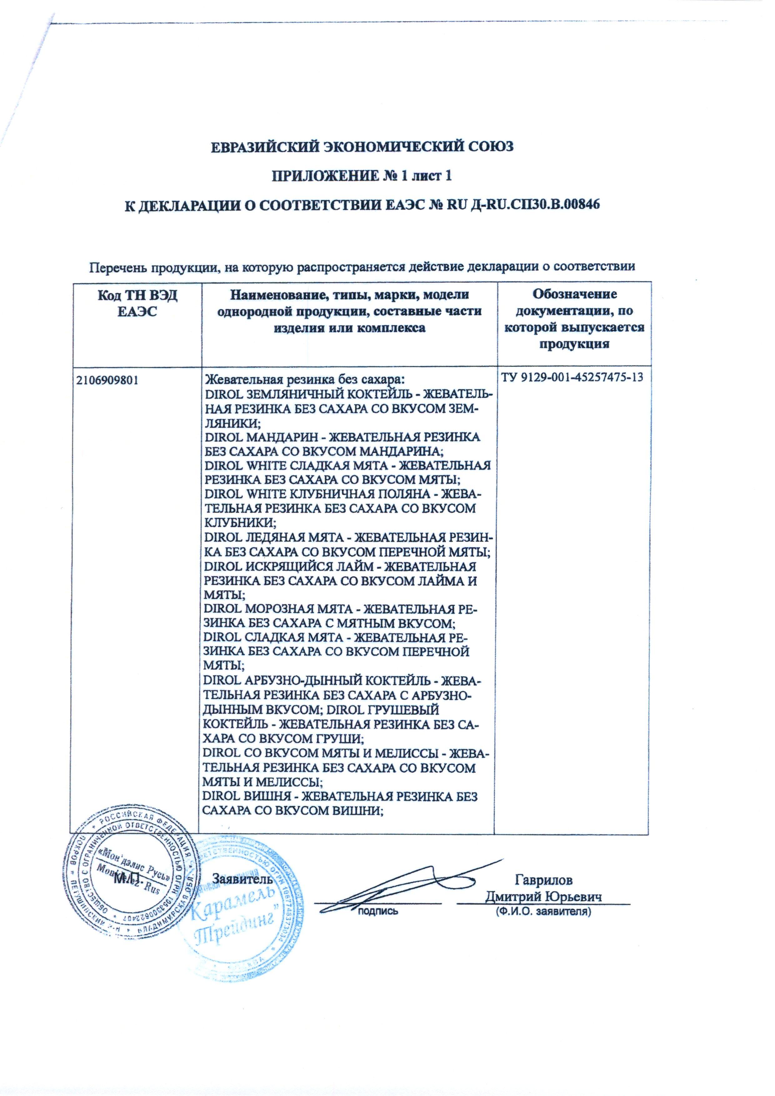 Состав: подсластители (сорбит, мальтит, мальтитний сироп, сукралоза, ацесульфам калия), резиновая основа, ароматизаторы искусственные «мята перечная», «ментол», «охлаждающий», загуститель (Е414), влагоудерживающий агент (Е422), краситель пигмент неорганический (Е171), эмульгатор (лецитин подсолнечный), глазирующий агент (Е903), антиоксидант (Е321).