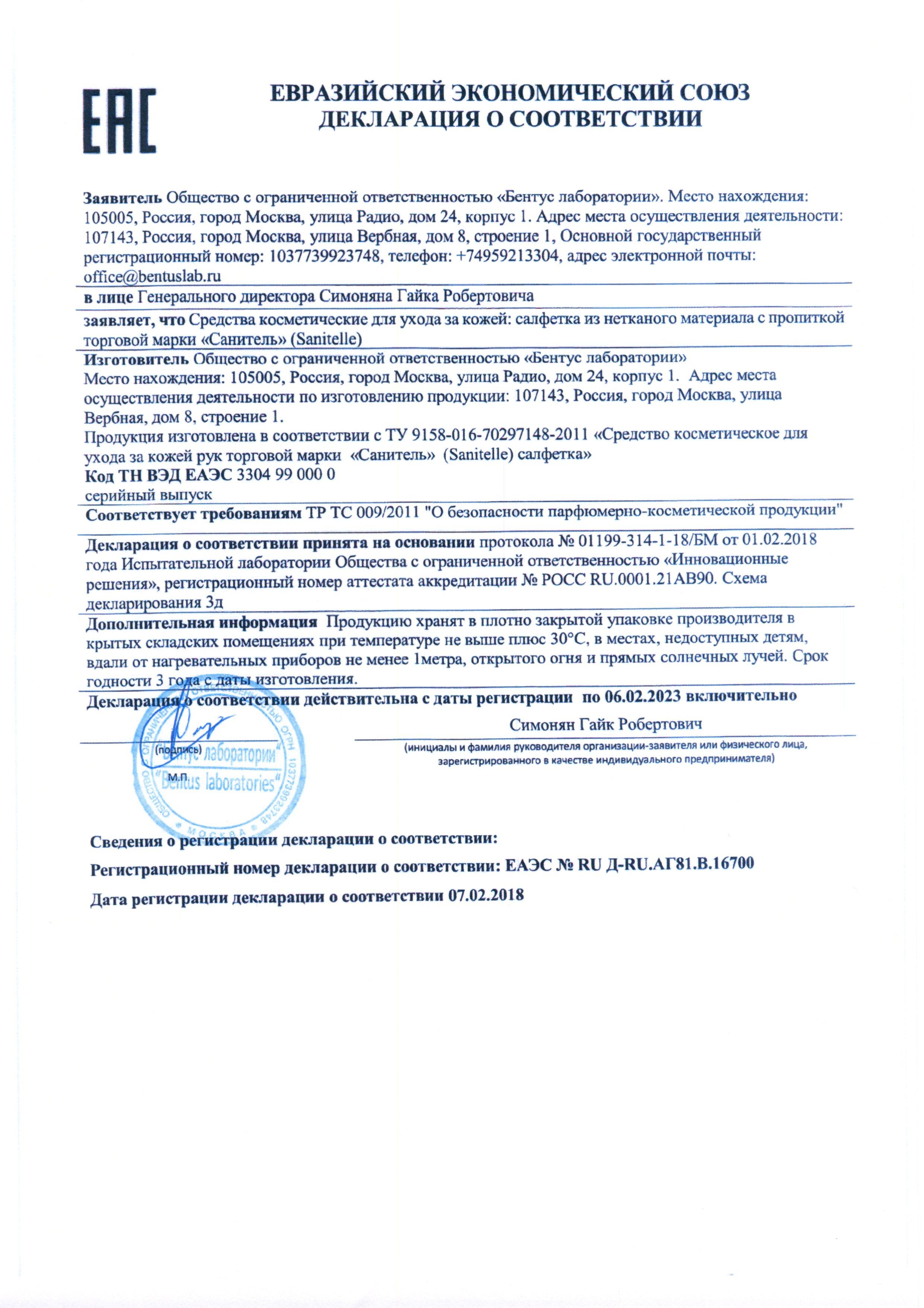Сертификат на товар - Салфетка для рук антисептическая Sanitelle Спиртовая 200x250 мм