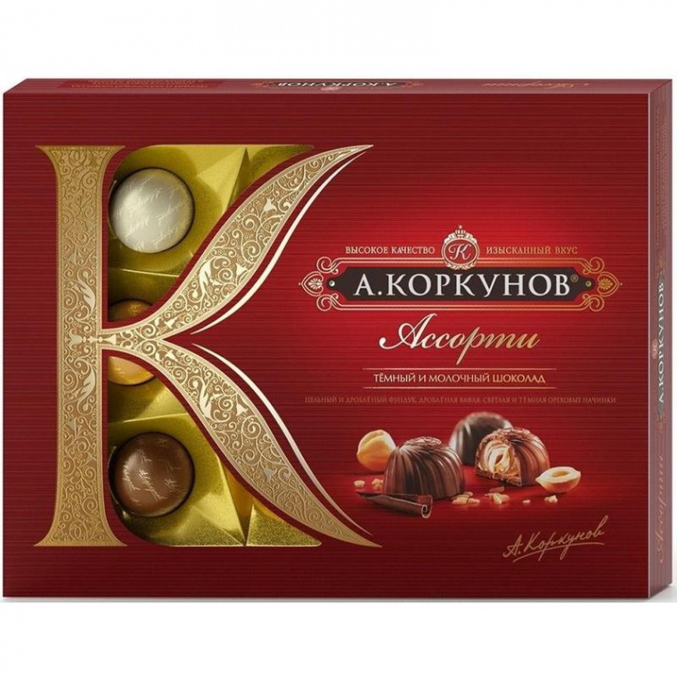 Шоколадные конфеты «А.Коркунов» ассорти из темного и молочного шоколада 110 г — это восхитительное ассорти, созданное из высококачественных какао-бобов и тщательно отобранных лесных орехов.