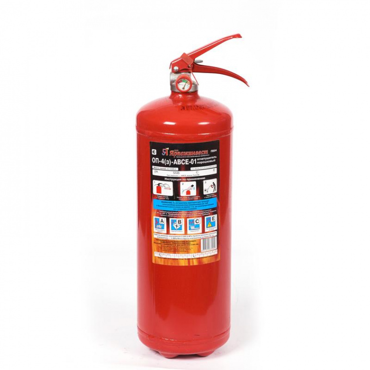 Огнетушитель порошковый ОП-4 (з) АВСЕ предназначен для защиты помещений производственного и хозяйственного назначения, применения на автомобильном, железнодорожном, речном транспорте, морских судах и в бытовых условиях в качестве первичных средств тушения пожаров классов А (твердых горючих веществ), В (жидких горючих веществ), С (газообразных горючих веществ) и электроустановок, находящихся под напряжением до 1000 В. Огнетушитель не предназначен для тушения загораний щелочных и щелочноземельных металлов и материалов, горение которых может происходить без доступа воздуха. Комплектация огнетушитель заряженный с опломбированным ЗПУ с распылителем, руководство по эксплуатации, объединенное с паспортом.