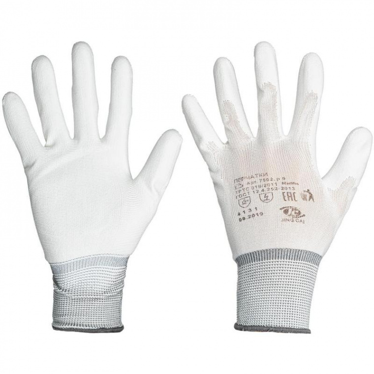 Рабочие перчатки нейлоновые c частичным полиуритановым белым покрытием, вязанные, бесшовные. Размер 9 или L. Обладают высокой чувствительностью при работе с мелкими деталями, а также износостойкостью. Широкий диапозон применения. Количество в упаковке: 1 пара. Количество упаковок в транспортном коробе: 120. Соответствуют ТР ТС 019/2011.