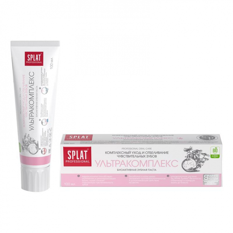 Зубная паста Splat Professional Ultracomplex (100 мл) — мультиактивная зубная паста, которая бережно заботится о белизне чувствительных зубов и здоровье десен, а также прекрасно освежает дыхание. Активный кальцис, полученный из яичной скорлупы, в сочетании с гидроксиапатитом эффективно укрепляет зубную эмаль, устраняя причину повышенной чувствительности зубов. Сочетание натуральных ферментов из папайи с компонентом Polydon расщепляет налет, способствуя качественной очистке и долгой свежести дыхания. Защита от бактерий благодаря ионам цинка. Ионы цинка оказывают вяжущее и противовоспалительное действие на десны.