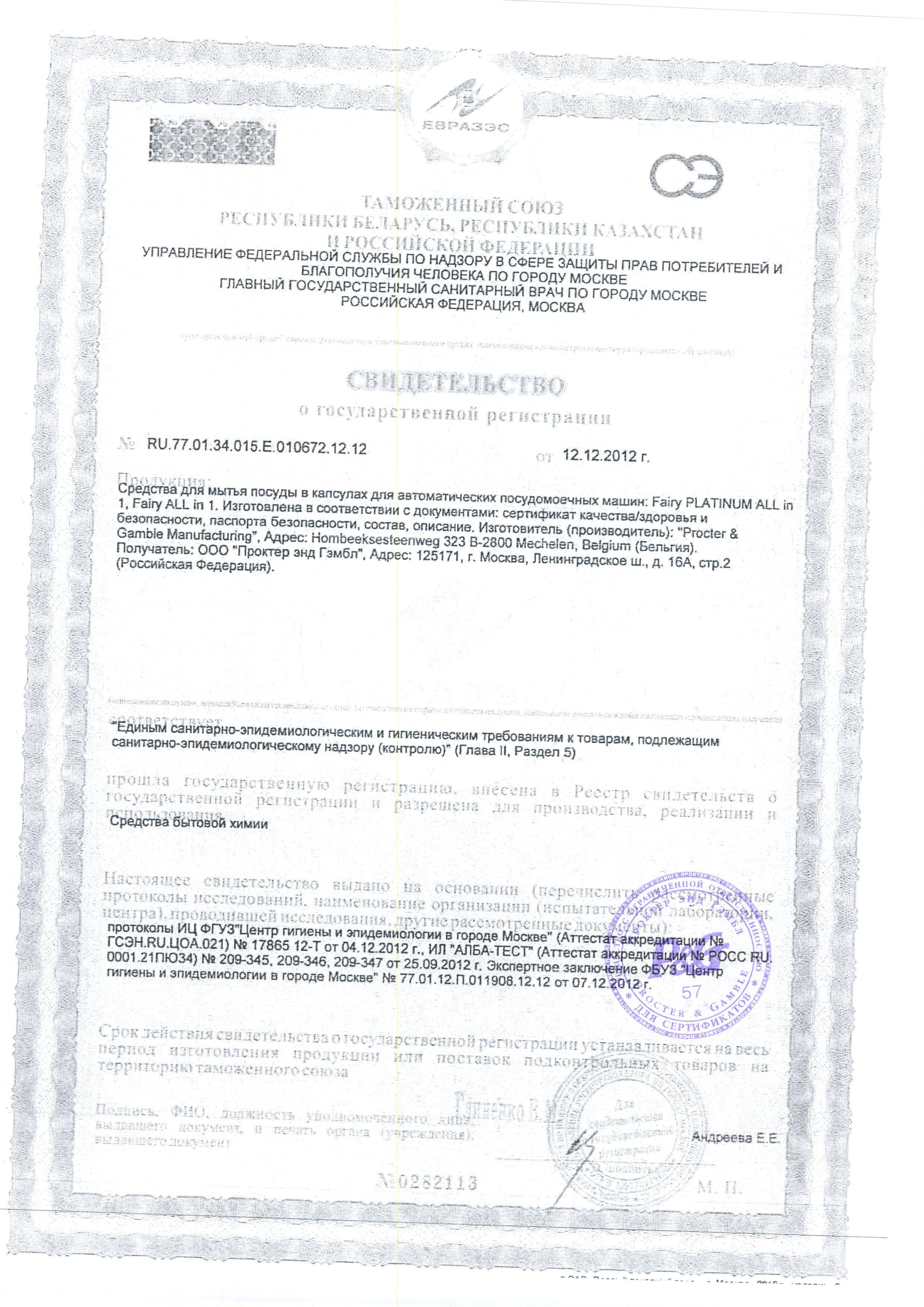 Сертификат на товар - Капсулы для посудомоечных машин Fairy Platinum All in One (50 штук в упаковке)