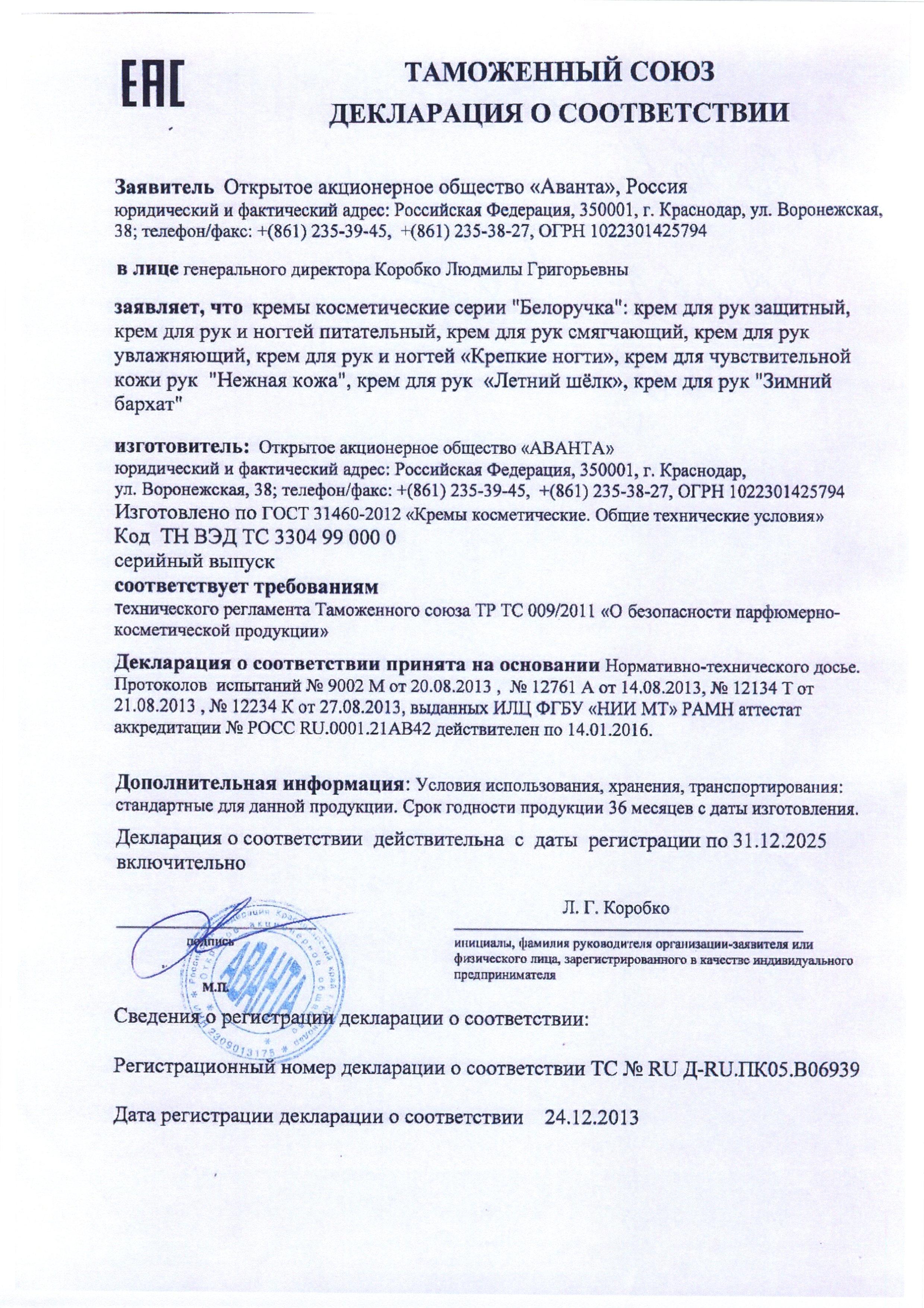 Сертификат на товар - Крем для рук Белоручка смягчающий 75 мл