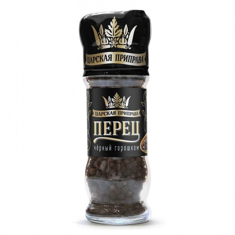 Перец черный горошком Царская приправа мельница 43 г по праву считается «королем специй». Черный перец издавна зовется «жгучей розой Востока». В cредние века перец служил валютой — за этой экзотической пряностью снаряжались экспедиции в Индию; он подтолкнул начало эпохи Великих географических открытий и изменил ход истории человечества. Перец чёрный горошек добавляется в тушеные и отварные блюда из мяса и рыбы, используется при консервировании и мариновании огурцов, овощей, грибов. Не забудьте положить несколько зерен черного перца в домашний борщ, уху, маринад для шашлыка.