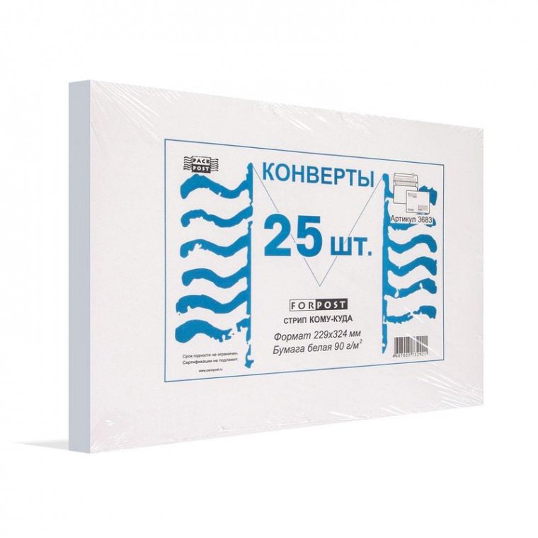 Конверт С4 (соответствует формату бумаги А4) (соответствует формату бумаги А4) 229×324 мм выполнен из офсета 90 г/кв.м, имеет клеевое нанесение типа стрип (отрывная силиконовая лента) и почтовый подсказ 'Куда-Кому'. Предназначены для пересылки 50 листов А4 формата, что равно 250 гр.веса. Удобен для пересылки документов формата A4. Упакован в пленку по 25 штук. Срок годности 1 год по ГОСТ. Показатель белезны бумаги — 143–149 %.