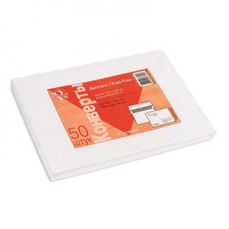 Конверт С4 (соответствует формату бумаги А4) 229×324 мм выполнен из офсета 90 г/кв.м, имеет клеевое нанесение типа декстрин (смачиваемый или водорастворимый клей) и почтовый подсказ 'Куда-Кому'. Предназначены для пересылки 50 листов А4 формата, что равно 250 гр.веса. Удобен для пересылки документов формата A4. Упакован в пленку по 50 штук. Срок годности 1 год по ГОСТ. Показатель белезны бумаги — 143–149 %.