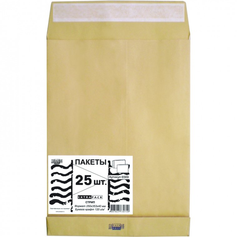 Пакет почтовый Extrapack формата B4, размер — 250×353 мм. Выполнен из крафт-бумаги плотностью 120 г/кв.м. Имеет клеевое нанесение типа стрип (отрывная силиконовая лента). Боковое и донное расширение — 40 мм. Предназначен для почтовых отправлений различной многостраничной документации и объемных вложений. Размер клапана, ширина — 70 мм. В упаковке 25 почтовых пакетов. Срок годности 1 год по ГОСТ.