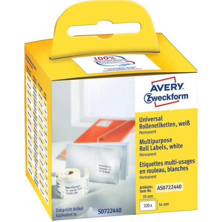 Белые универсальные этикетки в ролях AS0722440 совместимы с ленточными принтерами Dymo® Labelwriter модели LW310, LW330T, LW400, а также LW450 и с принтерами Seiko Smart LabelPrinter.