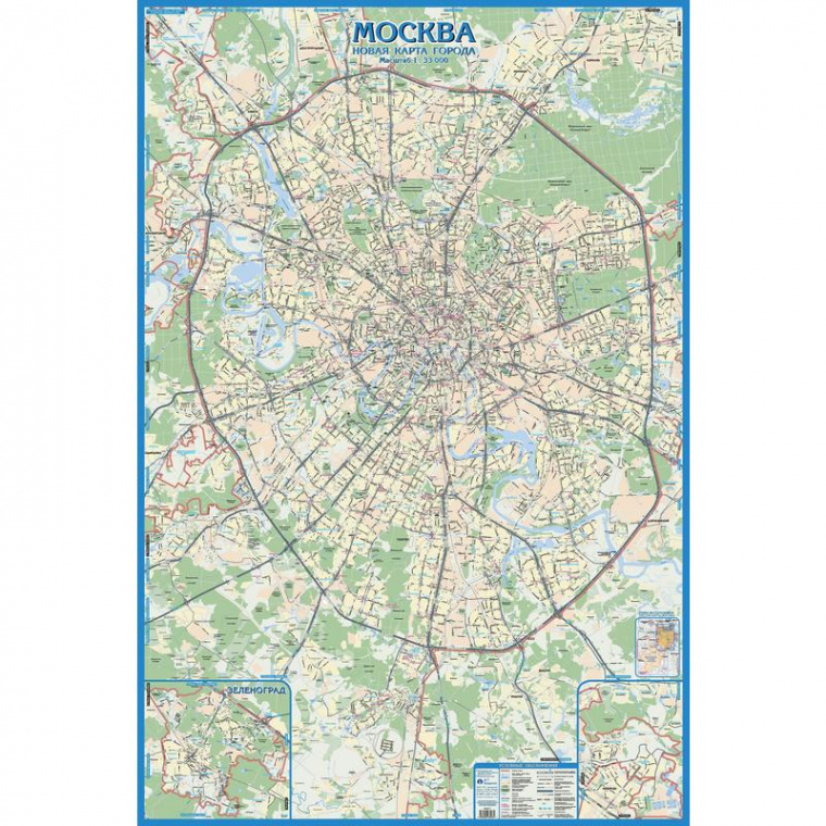 Настенная карта. Размер — 1600×1070 мм. Отпечатана на бумаге с матовой ламинацией. В тубусе. Масштаб — 1:33000. На карте подробно представлена дорожная сеть Москвы. Обозначены развязки, посты ДПС и светофоры, стоящие на главных дорогах. На карте показано ТТК и четвёртое транспортное кольцо. Указаны номера угловых домов.