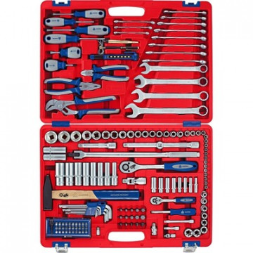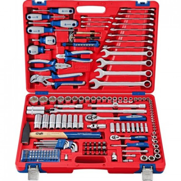 Набор инструмента универсальный Мастак 155 предметов (01-155C) укомплектован: головки и принадлежности 1/2 головки торцевые стандартные 6-гранные 10, 11, 12, 13, 14, 15, 16, 17, 18, 19, 21, 22, 24, 27, 30, 32 мм. головки торцевые глубокие 6-гранные 10, 12, 13, 14, 17, 19, 22, 24 мм. головки торцевые TORX Е-стандарт E10, E12, E14, E16, E18, E20, E22, E24 головки свечные 6-гранные 14, 16 мм. Удлинители стандартные 125, 250 мм. Трещотка флажковая с кнопкой 45 зубцов, длина 250 мм. Вороток с шарниром 430 мм. Кардан 1 шт. Переходник с отверстием для воротка 3/8 дюйма; дюйма; х 1/2 дюйма; дюйма; Переходник адаптер для вставок (бит) F1/2 F5/16 дюйма; дюйма; (8 мм.) головки и принадлежности 1/4 головки торцевые стандартные 6-гранные 4, 4,5, 5, 5,5, 6, 7, 8, 9, 10, 11, 12, 13 мм. головки торцевые глубокие 6-гранные 6, 7, 8, 9, 10, 11, 12, 13 мм. головки торцевые TORX Е-стандарт E4, E5, E6, E7, E8 Удлинители стандартные 50, 100 мм. Трещотка флажковая с кнопкой 45 зубцов, длина 125 мм. Переходник адаптер для вставок (бит) F1/4 F1/4 дюйма; дюйма; Кардан 1 шт. Отвертка-вороток 150 мм. Вставки (биты) 1/4 дюйма; дюйма; (6,35 мм.) Набор вставок с держателем для дрели 31 предмет Вставки (биты) 5/16 дюйма; дюйма; (8 мм.) Крестовые PH3, PH4 Шлицевые Slotted 8, 10, 12 мм. TORX T40, T45, T50, T55, T60 Шестигранные H7, H8, H10, H12, H14 Ключи Ключи комбинированные 8, 9, 10, 11, 12, 13, 14, 15, 16, 17, 18, 19, 21, 22, 24 мм. Отвертки Крестовые 1 х 75 мм. 2 х 100 мм. 2 х 38 мм. Шлицевые Slotted 5,5 х 75 мм. 6,5 х 100 мм. 6,5 х 38 мм. Шарнирно-губцевый инструмент Плоскогубцы, комбинированные длина 175 мм. Бокорезы стандартные длина 150 мм. Захват переставной длина 250 мм. Прочий инструмент Набор шестигранников 1,5, 2, 2,5, 3, 4, 5, 6, 8, 10 мм. Молоток 500 гр. Магнит телескопический 1 шт. Индикатор напряжения 6-24 В Фонарь LED Pen 1 шт.