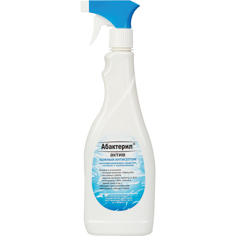 Антисептик кожный спрей 'Абактерил Актив' спиртовой 750 мл. Химический состав средства: ЧАС, гуанидин, спирты, вспомогательные компоненты. Действующие вещества: алкилдиметилбензиламмоний хлорид (АДБАХ) 0.1 %, изопропиловый спирт (пропанол-2) 64 %, компоненты, улучающие состояние кожи, полигексаметиленгуанидин гидрохлорид (ПГМГ) 0.1 %. Сфера применения: акушерские стационары, ЛПУ, клинические лаборатории, станции переливания крови, бактериологические лаборатории, детские учреждения (детсады, школы и т.п.), пенитенциарные учреждения, инфекционные очаги, предприятия общественного питания, потребительские рынки, коммунальные объекты (бани, бассейны, гостиницы, общественные туалеты и т.п.), учреждения соцобеспечения, парикмахерские, косметические и массажные салоны, санитарный транспорт, отделения неонатологии, в быту населением, аптеки, учреждения культуры, отдыха (кинотеатры, музеи, театры), спортивные и культурно-оздоровительные комплексы, объекты курортологии, диагностические лаборатории, вирусологические лаборатории. Объекты обработки: гигиеническая обработка рук, жесткая мебель, кресла гинекологические, стоматологические, обработка инъекционного поля, обработка локтевых сгибов доноров, обработка операционного поля, обработка рук операционных медицинских сестер, акушерок и других лиц, участвующих в операциях и приеме родов, обработка рук хирургов, обувь, перчатки (из каучука, латекса, неопрена и т.д.), поверхности в помещениях, поверхности приборов и аппаратов, предметы обстановки, резиновые и полипропиленовые коврики, транспорт для перевозки пищевых продуктов. Класс опасности: при введении в желудок - 4; при нанесении на кожу - 4; рабочего раствора - 4. Активно в отношении: бактерии (Mycobacterium tuberculosi, возбудители ВБИ, грамотрицательные бактерии, грамположительные бактерии), вирусы (атипичной пневмонии, ВИЧ, герпеса, грипп, парентеральных гепатитов, полиомиелит, птичьего гриппа (H5N1), свиной грипп (H1N1), энтеральных гепатитов), патогенные грибы (дерматофитон, кандида). Особые свойства: обладает пролонгированным антимикробным эффектом. Срок годности: 5 лет. Страна производства: Россия.