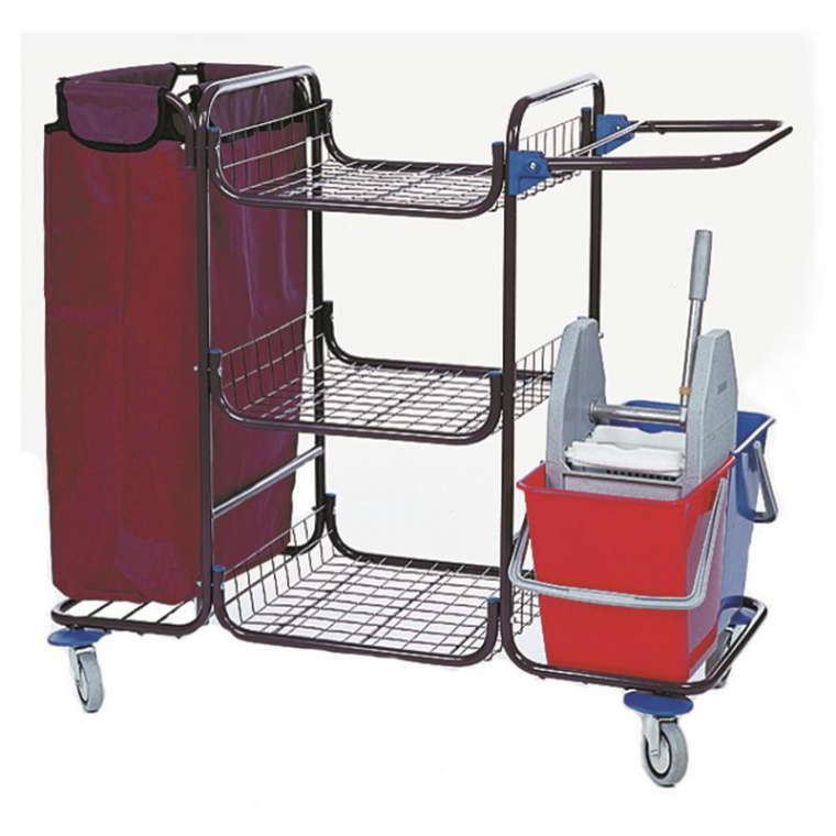 Тележка для горничной «Кабриолет». Предназначена для проведения работ по обслуживанию номерного фонда. Комплектуется тремя сетчатыми полками для перевозки белья, мешком для сбора грязного белья из прочного нейлона на 135 л, ведрами с механическим отжимом для уборки помещений, откидным кронштейном для удобства транспортировки. Диаметр колес 100 мм с противоударными бамперами.