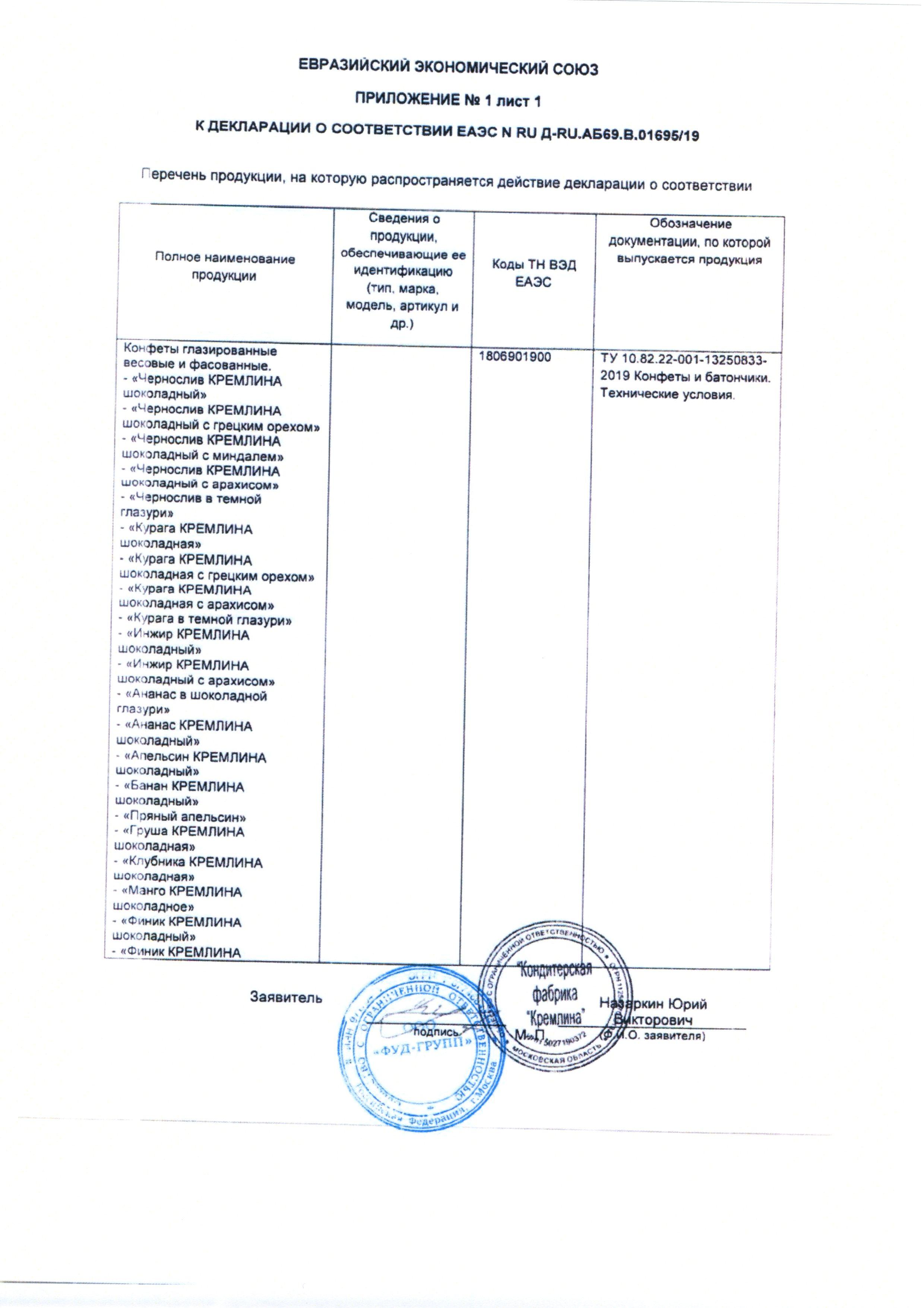 Состав: абрикос сушеный (курага), слива сушеная (чернослив), вишня сушеная, глазурь кондитерская (сахар-песок, заменитель масла какао, какао-порошок, эмульгатор — лецитин соевый, ароматизатор идентичный натуральному «Ванилин»), арахис жареный дробленый, финик сушеный, инжир сушеный, фруктовый наполнитель (пюре абрикосовое, пюре сливовое, сахар, загуститель Е1422, консервант — сорбиновая кислота), глазурь шоколадная (сахар, какао тертое, эквивалент масла какао, какао-порошок, масло какао, эмульгатор лецитин соевый (Е 322), эмульгатор (Е476), ароматизатор идентичный натуральному «Ванилин»), ядро миндаля жареное, ядро фундука жареное, цукаты ананаса, глянцеватель «Квик Шайн».