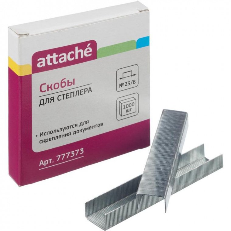 Скобы для степлера № 23/8 Attache предназначены для степлеров со сшивающей способностью от 30 до 50 листов. Скобы № 23/8 выполнены из цинкового металла. 1000 скоб в картонной упаковке. В промежуточной упаковке — 10 пачек по 1000 скоб.