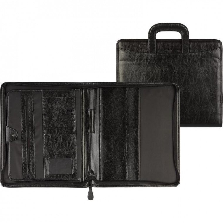 Папка Навигатор 108и на молнии, с выдвижными ручками, VIP-серия. Размер 360х300х50 мм. Материал - заменитель кожи, цвет черный. Папка на молнии с выдвигающимися ручками, благодаря которым можно использовать папку как портфель. Имеет два накладных кармана, внутреннее отделение, застегивающееся на кнопку, держатель для ручки и много кармашков разного размера.