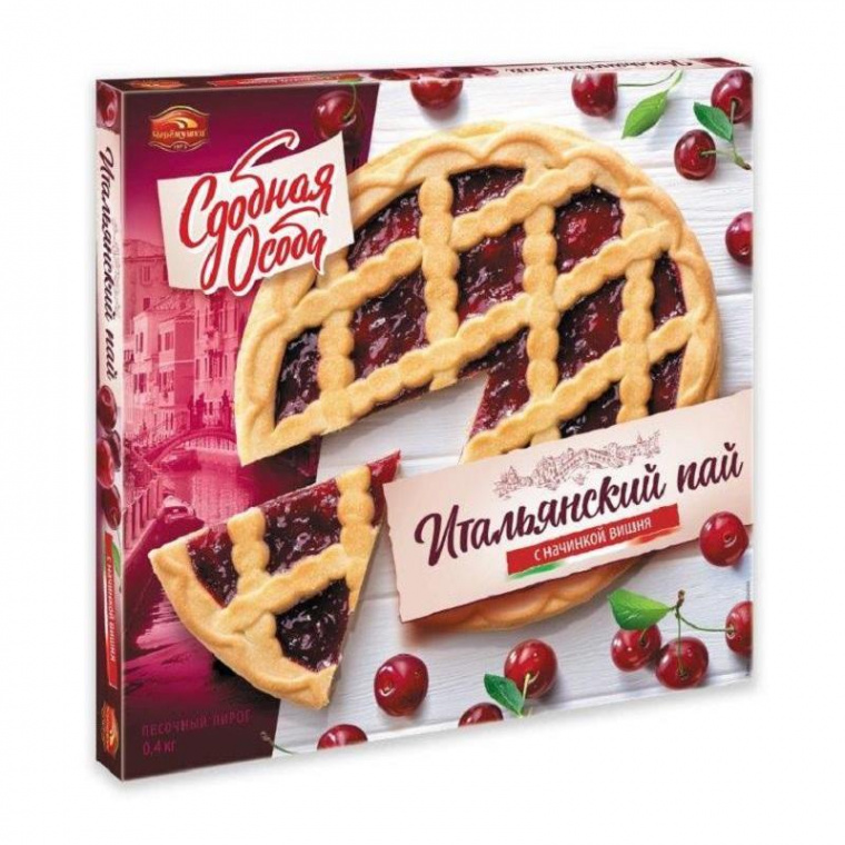 Песочный пай Черемушки «Сдобная особа с вишневой начинкой» упакован в удобную картонную коробку с красочным изображением вкуснейшей выпечки.