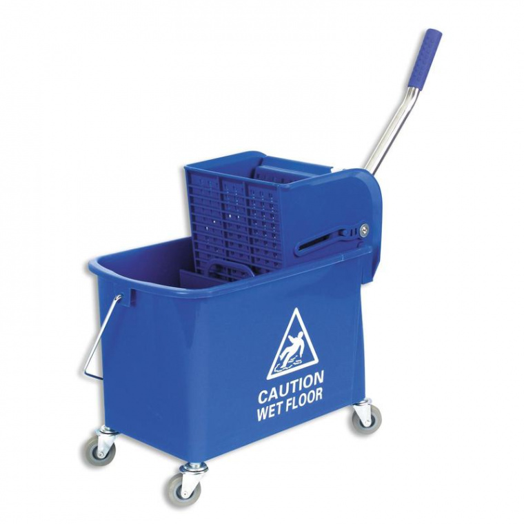 Ведро на колесах с механическим отжимом для швабр двух типов: плоского флаундерa и «Кентукки». Изделие изготовлено из ударопрочного пластика, его габариты составляют 47×27 см. Ведро имеет две секции (перегородка съёмная), перекидную металлическую ручку и поворотные колеса из стали, оснащенные пластиковыми протекторами. Емкость ведра — 20 литров. По обеим сторонам инвентаря имеется знак «Осторожно, скользко».