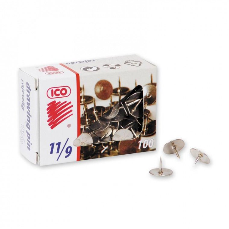 Кнопки канцелярские ICO с металлической шляпкой диаметром 11 мм и металлической игольчатой ножкой. Длина иглы 9 мм. В картонной упаковке 100 кнопок. В коробке 256 упаковок.