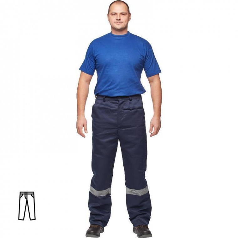 Брюки рабочие летние мужские л03-БР (размер 52-54, рост 170-176) синего цвета. Изготовлены из смесовой ткани с водоотталкивающей пропиткой (80% полиэфир, 20% хлопок) , плотность ткани — 220 г/кв.м. Брюки прямого силуэта с застежкой на пуговицы и боковыми накладными карманами. Сигнальные элементы выполнены из световозвращающего материала. Соответствует стандарту ГОСТ 27575-87