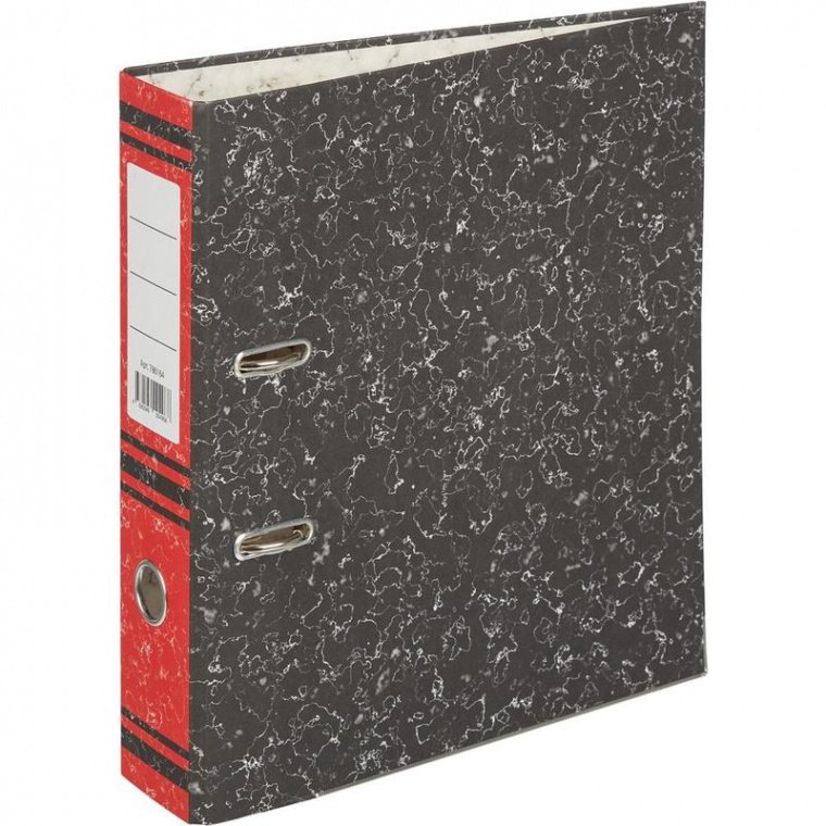 Папка-регистратор с арочным механизмом изготовлена из плотного картона толщиной 2 мм, с внешней стороны оклеена износостойкой бумагой «под мрамор». Формат А4. Нижние края защищены металлическим кантом. Прорези на внешней крышке удерживают папку закрытой даже при большом количестве документов. На корешок красного цвета шириной 75 мм наклеена этикетка, есть кольцо для захвата. Папка-регистратор вмещает до 480 листов стандартной плотности.