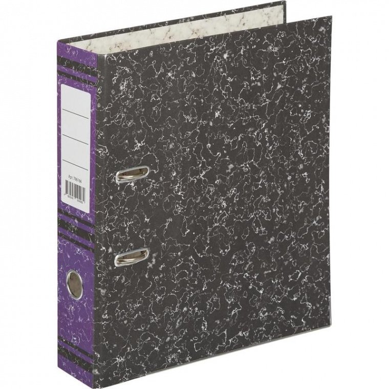Папка-регистратор с арочным механизмом изготовлена из плотного картона толщиной 2 мм, с внешней стороны оклеена износостойкой бумагой «под мрамор». Формат А4. Нижние края защищены металлическим кантом. Прорези на внешней крышке удерживают папку закрытой даже при большом количестве документов. На корешок фиолетового цвета шириной 75 мм наклеена этикетка, есть кольцо для захвата. Папка-регистратор вмещает до 480 листов стандартной плотности.