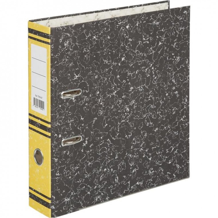 Папка-регистратор с арочным механизмом изготовлена из плотного картона толщиной 2 мм, с внешней стороны оклеена износостойкой бумагой «под мрамор». Формат А4. Нижние края защищены металлическим кантом. Прорези на внешней крышке удерживают папку закрытой даже при большом количестве документов. На корешок желтого цвета шириной 75 мм наклеена этикетка, есть кольцо для захвата. Папка-регистратор вмещает до 480 листов стандартной плотности.