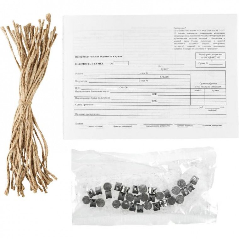 Набор для хранения денежных средств предназначен для проведения ежедневной инкассации. В набор входят: 33 свинцовые пломбы, 33 джутовых 15-сантиметровых шнура для опломбирования инкассаторских сумок, мешков, баулов; 33 комплекта по 3 листа препроводительных ведомостей для оформления, сопровождения и контроля инкассации наличности.