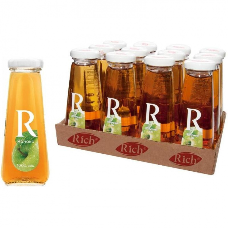 Сок Rich яблоко 0.2 л (12 штук в упаковке). Умелое сочетание тщательно отобранных сортов яблок создает особый вкус Rich «яблоко». При комнатной температуре в аромате сока чувствуются нежные цветочные ноты. Сбалансированный, обволакивающий вкус спелого сочного яблока мягкий,