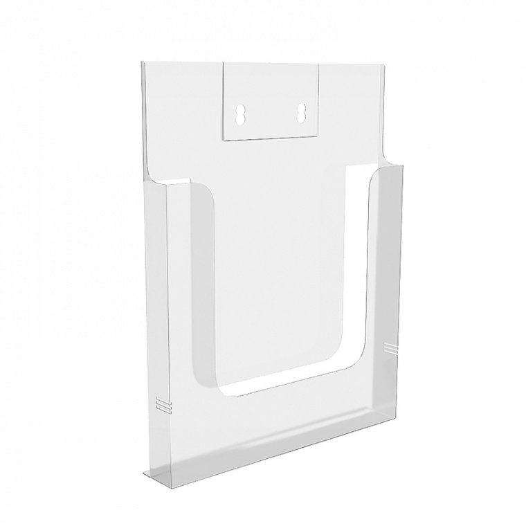 Держатель буклетов формата А4. Может располагаться на столе или крепиться к стене, есть отверстия для подвешивания. Также есть возможность крепежа на рекламные стойки c помощью специальной клипсы (в комплект не входит).