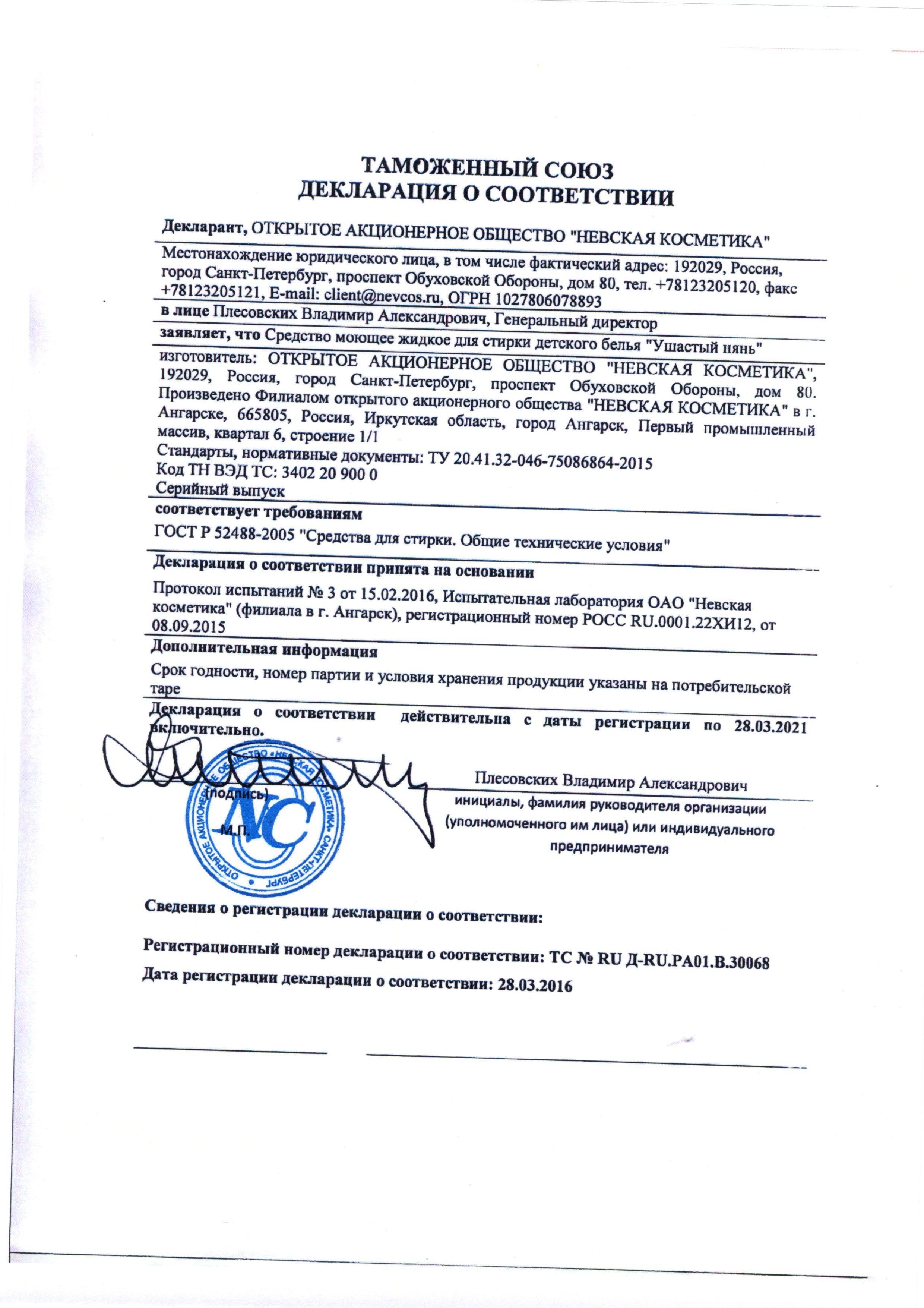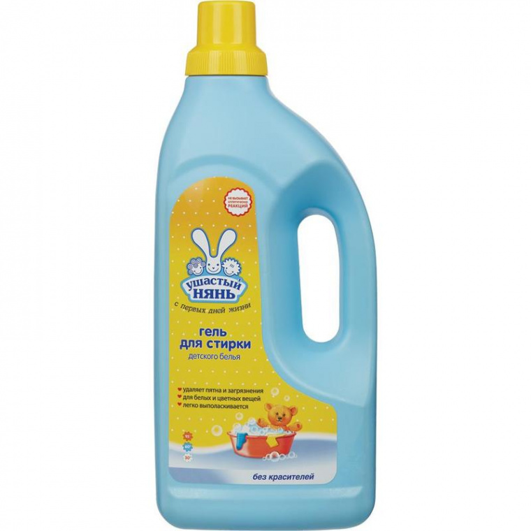 Гель для стирки Ушастый нянь для детского белья 1.2 лНазначение: Средство предназначено для стирки детского белья, в том числе новорожденных, из хлопчатобумажных, льняных, синтетических тканей, а также тканей из смешанных волокон (кроме изделий из натурального шелка и шерсти).Способ применения: - Замачивание(на 5 л воды) - 45 мл (1 колпачок) в мягкой воде/ 68 мл (1,5 к) в жесткой воде - при температуре 30-40С; - Ручная стирка(на 5 л воды) - 45 мл (1 колпачок) в мягкой воде/ 68 мл (1,5 к) в жесткой воде- при температуре до 50С; - Стирка в автоматических стиральных машинах (на 4-5 кг белья) - 90 мл (2 к) в мягкой воде/ 113 мл (2,5 к) в жесткой воде- -при температуре 30-95С; 1 к (колпачок) = 45 мл.Меры предосторожности: При попадании раздражает кожу и глаза (глаза промыть водой, обратиться к врачу). Беречь от детей. Работать в резиновых перчатках, затем вымыть руки. При необходимости использовать дополнительное полоскание. Токсично для водных организмов. Избегать попадания в окружающую среду.Состав: 5-15% мыло, НПАВ, АПАВ; Условия хранения: Хранить в плотно закрытом флаконе, отдельно от пищевых продуктов, в недоступном для детей месте, при температуре до +35# С. Срок годности: 24 месяцев с даты изготовления.