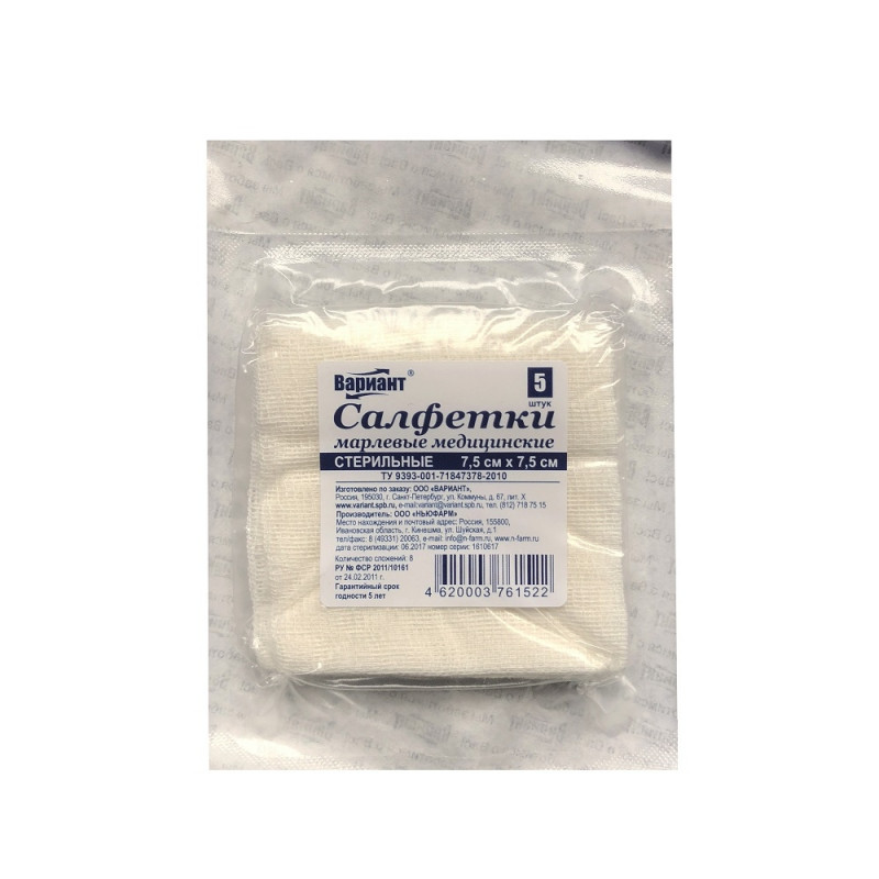 Марлевые салфетки 8-ми слойные, сложенные из полоски марли. Салфетка марлевая медицинская стерильная -применяется для использования в качестве готовых операционно-перевязочных средств, для наложения повязок, осушения ран, при перевязках и операциях, для тампонады с целью остановки кровотечения и дренирования, закрепления перевязочного материала, давления на какую-нибудь часть тела (в основном, для остановки кровотечения), предупреждения отека тканей или удержания конечности либо иной части тела в неподвижном состоянии, а так же для защиты раны или измененной поверхности кожи от воздействия внешней среды -фиксируются бинтом или медицинским пластырем. Для обеспечения полной безопасности края салфеток марлевых сложены внутрь. Стерилизация радиационная. Наличие протокола стерилизации и инструкции по радиационной стерилизации медицинских изделий. Материал: 100% хлопок, отбеленный. Размер 7,5х7,5 см, 8 слоев, 17 нитей, 5 штук в упаковке