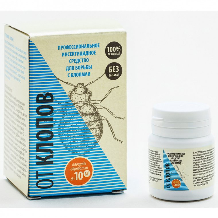 Назначение: Водорастворимый порошок — профессиональное инсектицидное средство, предназначенное для уничтожения клопов. В настоящее время это одно из немногих средств в мире, которое эффективно уничтожает клопов, так как к большинству инсектицидов у клопов выработалась стойкая устойчивость. Средство также высокоэффективно против тараканов, блох, личинок комаров.