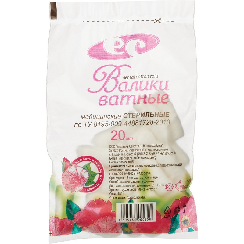 Валики ватные медицинские стерильные по ТУ 8195-009-44881728-2010, используемые в стоматологии, изготовлены из 100% отбеленного хлопка-волокна I сорта, цикл производства валика стоматологического проходит на автоматизированном современном оборудовании, которое формирует оптимальную плотность валика для использовании в различных областях стоматологии, челюстной хирургии и терапии. Ватные валики для стоматологии. Упаковка: п/э пакет, стерильные 20 шт., Состав: 100% хлопок