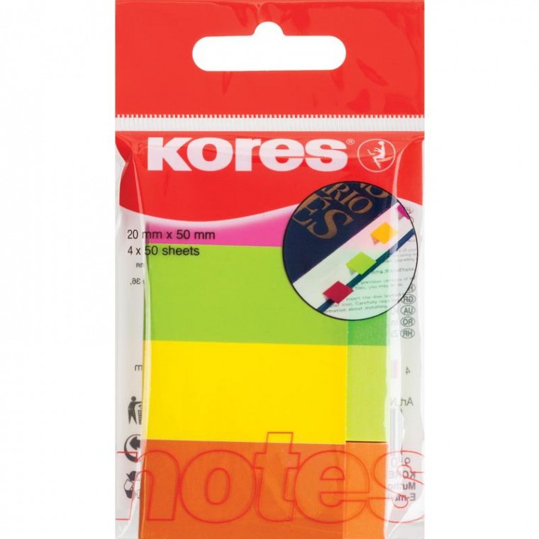 Самоклеящиеся закладки Kores Index Stripes шириной 20 мм помогают выделить и систематизировать нужную информацию в документах, книгах, журналах. Выполнены из бумаги, подходят для нанесения надписей шариковой ручкой. В упаковке — закладки четырех «неоновых» цветов по 50 штук каждого.