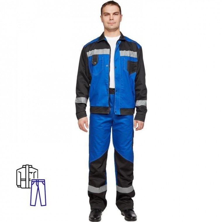 Спецодежда костюм мужской л21-КБР состоит из куртки и брюк (размер 52-54, рост 170-176) василькового цвета с черными вставками. Изготовлен из смесовой ткани (65% — полиэстер, 35% — хлопок) плотностью 240 г/кв.м. Светоотражающая полоса шириной 50 мм размещена на груди, спине, рукавах, а также внизу брюк. Куртка c застежкой на молнию и кнопки. На куртке два верхних накладных кармана. Рукава с налокотниками и манжетами. Ширина пояса куртки регулируется кнопками. Брюки прямого силуэта с застежкой на пуговицы. На передней половине брюк расположены два накладных кармана со скошенным входом. На брюках сзади 2 накладных кармана, один из которых на кнопке, а также боковой накладной карман на кнопке. Весь костюм сшит контрастными нитками белого цвета, двойной строчкой. Костюм предназначен для защиты от общих производственных загрязнений и механических воздействий. ГОСТ 27575-87.