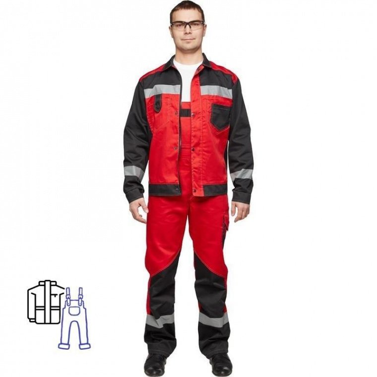 Спецодежда костюм мужской л21-КПК состоит из куртки и полукомбинезона (размер 64-66, рост 170-176) красного цвета с черными вставками. Изготовлен из смесовой ткани (65% — полиэстер, 35% — хлопок) плотностью 240 г/кв.м. Светоотражающая полоса шириной 50 мм размещена на груди, спине, рукавах, а также внизу полукомбинезона. Куртка c застежкой на молнию и кнопки. На куртке два верхних накладных кармана. Рукава с налокотниками и манжетами. Ширина пояса куртки регулируется кнопками. Полукомбинезон прямого силуэта с застежкой на пуговицы. На передней половине полукомбинезона расположены два накладных кармана со скошенным входом, а также один верхний накладной карман. На полукомбинезоне сзади 2 накладных кармана, один из которых на кнопке, а также боковой накладной карман на кнопке. Костюм предназначен для защиты от общих производственных загрязнений и механических воздействий. ГОСТ 27575-87.
