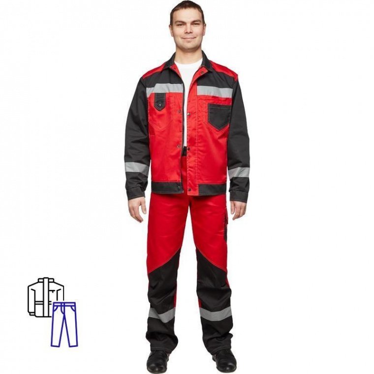 Спецодежда костюм мужской л21-КБР состоит из куртки и брюк (размер 56-58, рост 170-176) красного цвета с черными вставками. Изготовлен из смесовой ткани (65% — полиэстер, 35% — хлопок) плотностью 240 г/кв.м. Светоотражающая полоса шириной 50 мм размещена на груди, спине, рукавах, а также внизу брюк. Куртка c застежкой на молнию и кнопки. На куртке два верхних накладных кармана. Рукава с налокотниками и манжетами. Ширина пояса куртки регулируется кнопками. Брюки прямого силуэта с застежкой на пуговицы. На передней половине брюк расположены два накладных кармана со скошенным входом. На брюках сзади 2 накладных кармана, один из которых на кнопке, а также боковой накладной карман на кнопке. Весь костюм сшит контрастными нитками белого цвета, двойной строчкой. Костюм предназначен для защиты от общих производственных загрязнений и механических воздействий. ГОСТ 27575-87.